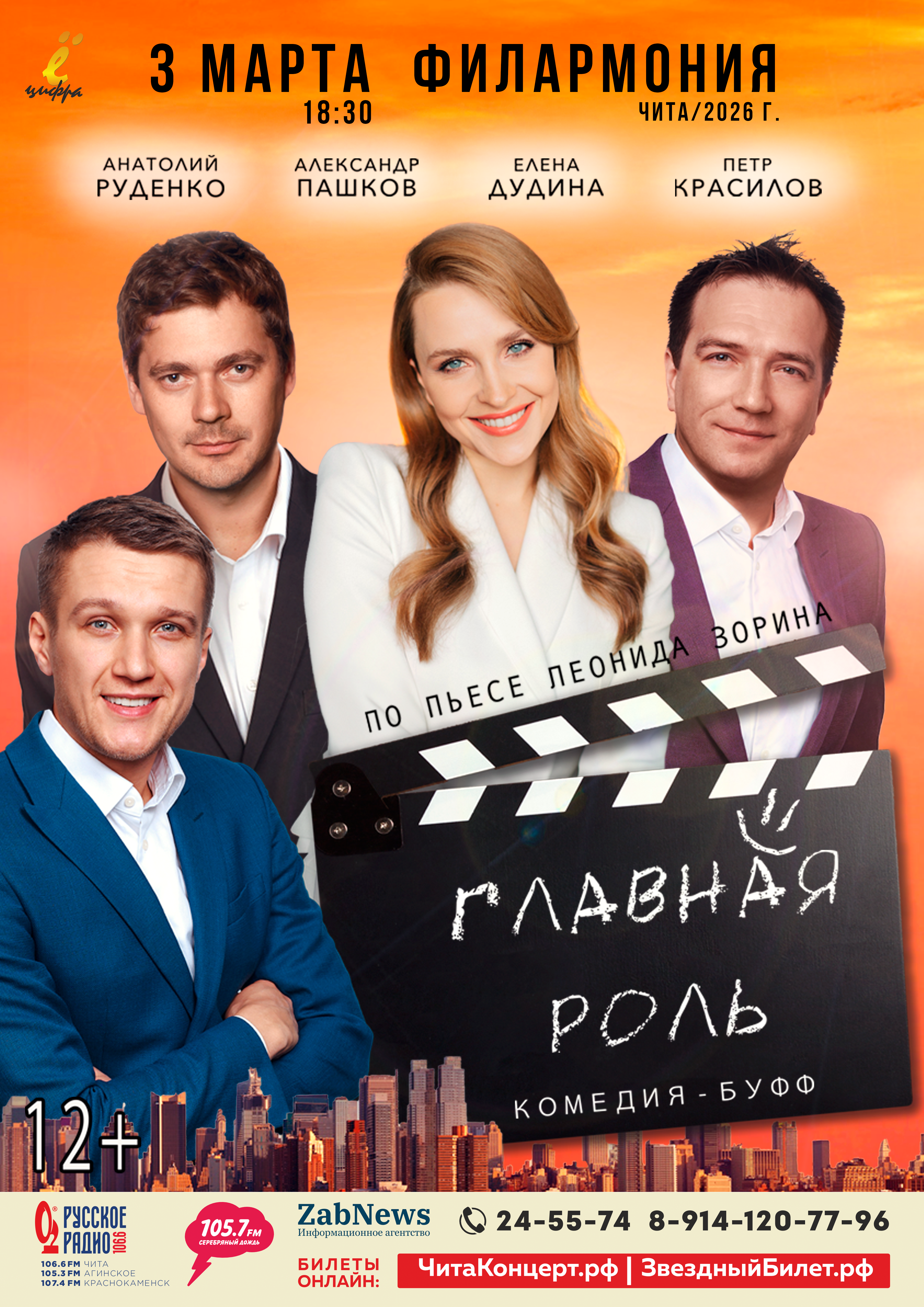 Спектакль «Главная роль» со звездным составом 3 марта 2026 в Чите! На одной сцене: Александр Пашков, Петр Красилов, Анатолий Руденко и Елена Дудина!