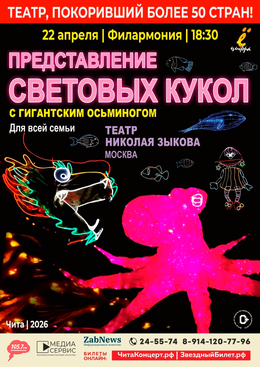 22 апреля в Чите! Уникальное представление световых кукол с гигантским Осьминогом. Театр Николая Зыкова (г. Москва)!