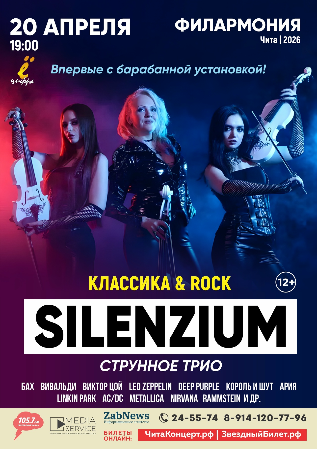 Струнное трио «SILENZIUM» выступит в Чите впервые с барабанной установкой! В программе: «Король и Шут», Бах, «Ария», Вивальди, Виктор Цой, «Linkin Park», «Metallica», «Deep Purple», «Queen», «Rammstein», «Nirvana», «The Prodigy», «Depeche Mode» и др.